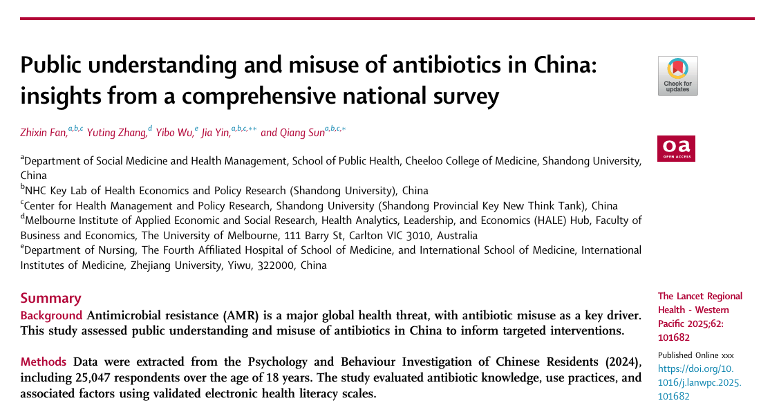 近日,必威登录入口平台官网必威官方首页官网betway社会医学与卫生事业管理学系孙强教授团队与墨尔本大学张昱婷教授、中国居民心理与行为调查研究(PBICR)团队在The Lancet Regional Health - Western Pacific(中科院和JCR Q1, IF=8.1)合作发表题为《Public Understanding and Misuse of Antibiotics in China: Insights from a Comprehensive National Survey》的文章。必威官方首页官网betway2022级硕博连读研究生樊智鑫为第一作者,必威登录入口平台官网为通讯作者单位,孙强与阴佳副教授为本文共同通讯作者。该工作得到国家自然科学基金委面上项目资助。