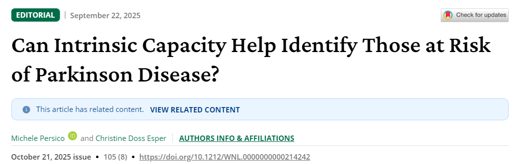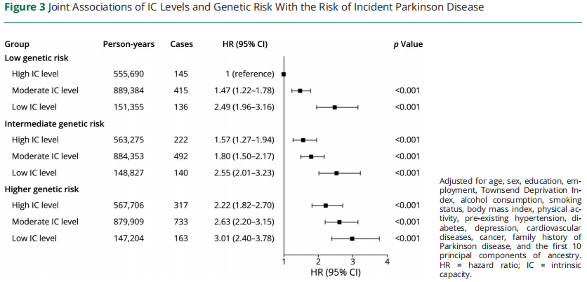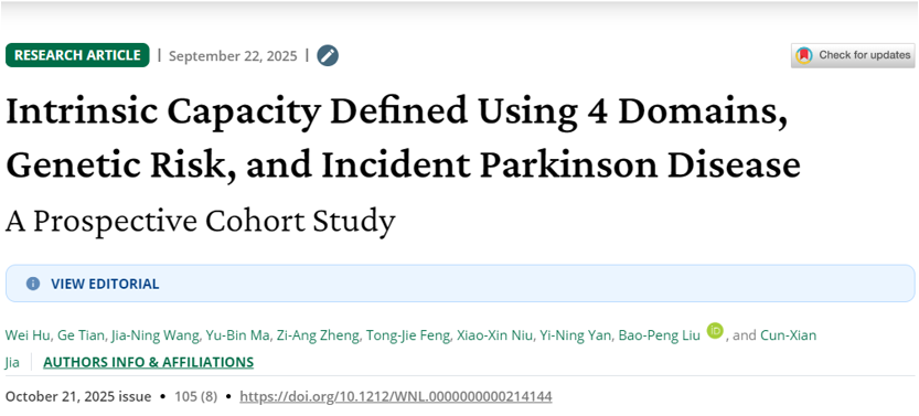 针对40万余名平均年龄56.6岁的参与者的英国生物样本库(UK Biobank)大规模队列,团队研究发现内在能力(IC,包括体力、感觉功能、活力和运动能力)与遗传风险在帕金森病发生中存在显著基因-表型交互。低IC与高遗传风险个体的发病风险最高(HR=3.01),但即便在高风险人群中,保持高水平IC仍能发挥保护作用(HR=0.72)。研究发现强调帕金森病虽受遗传影响,但并非无法干预。通过改善体能、运动能力和生活活力,可在一定程度上抵消遗传易感性,降低疾病发生率。这为神经退行性疾病的早期预防提供了重要证据。同期Neurology杂志编辑部以“Can Intrinsic Capacity Help Identify Those at Risk of Parkinson Disease?”为题针对该研究发表了评论,强调本文发现的重要性。该文以必威登录入口平台官网为第一和通讯作者单位,必威官方首页官网betway2023级博士研究生胡伟为本文第一作者,必威官方首页官网betway刘宝鹏研究员和贾存显教授为共同通讯作者。