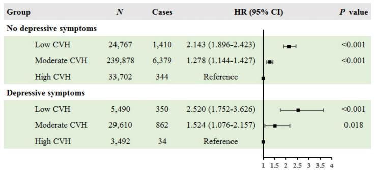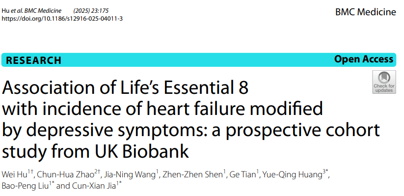 这项涵盖33.6万人的前瞻性研究揭示,“生命8要素”量化的心血管健康(CVH)水平与抑郁症状之间存在显著的交互作用。低CVH水平显著提高心力衰竭(HF)风险,而在伴随抑郁症状的个体中,这一负面效应更为突出(交互作用P = 0.016)。反之,无抑郁症状且具备高CVH的个体,其风险最低(HR=0.344)。研究发现强调HF不仅是心脏病学问题,也涉及心理健康管理。提升CVH行为(如戒烟、健康饮食、规律运动)同时加强心理干预,能够协同降低HF风险。该研究凸显了“身心一体”的预防理念,对脑心相关疾病防控尤为关键。该文以必威登录入口平台官网为第一和通讯作者单位,必威官方首页官网betway2023级博士研究生胡伟和南京医科大学附属苏州医院赵春华医师为共同第一作者,betway亚洲联赛预选赛刘宝鹏研究员、贾存显教授和南京医科大学附属苏州医院黄岳青教授为共同通讯作者。