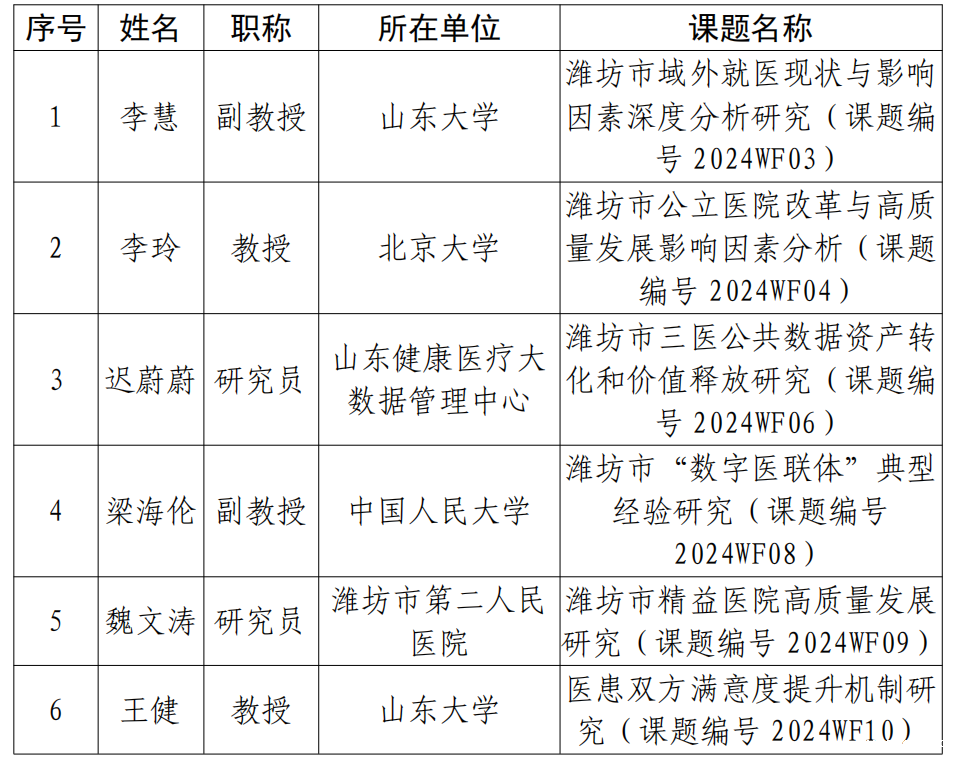 国家健康医疗大数据研究院于2024年11月28日发布《基于数据互通共享的潍坊市“三医”协同发展与治理研究开放课题申报通知》,12月10日中午12:00申请截止,共收到26份申报书,方向涵盖课题三、四、六、八、九、十。经专家网评和会议评审,最终遴选出6项课题予以资助。现公布如下: