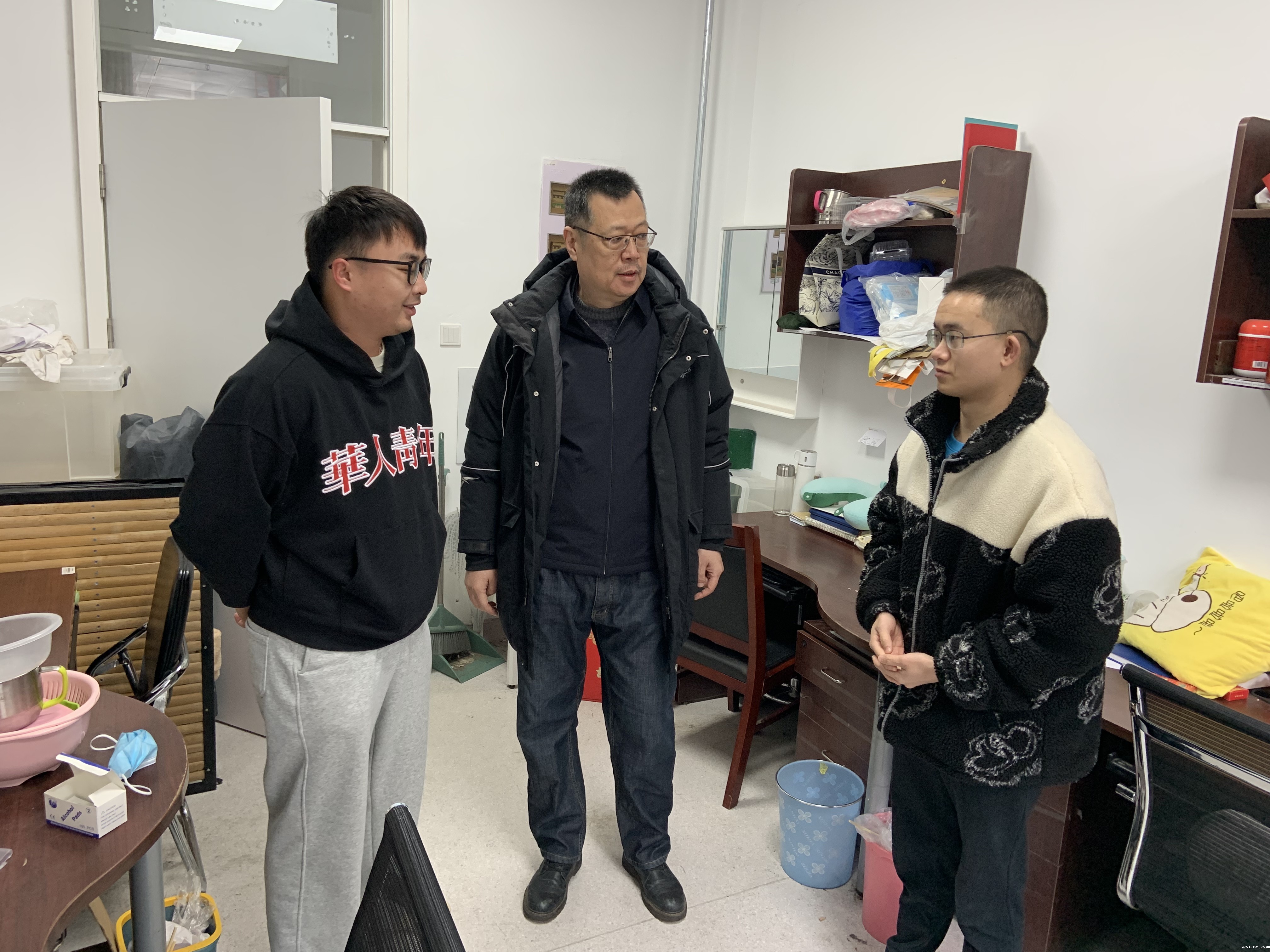在九号教学楼,李松涛实地查看实验室运行情况,并与寒假期间坚守岗位的研究生亲切交谈,了解同学们假期生活、学习和科研情况,叮嘱大家时刻牢记安全第一,严格遵守实验室安全规章和操作规范,忙碌之余注意劳逸结合,度过一个平安、健康、充实的新春佳节。
