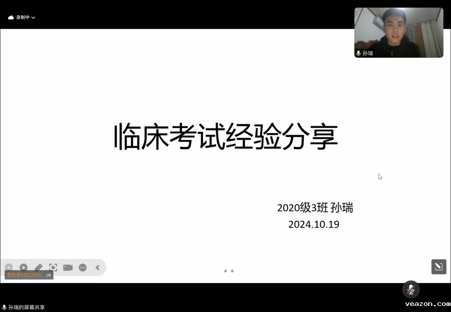 2020级孙瑞介绍了临床实习的考试组成及题型、出题、备考三方面。2020级聂利梅介绍了临床实习的笔试和临床操作,分享了自己总结的学习方法和经验。两位同学全面、详实、准确的分享增加了2021级对临床实习的了解。
