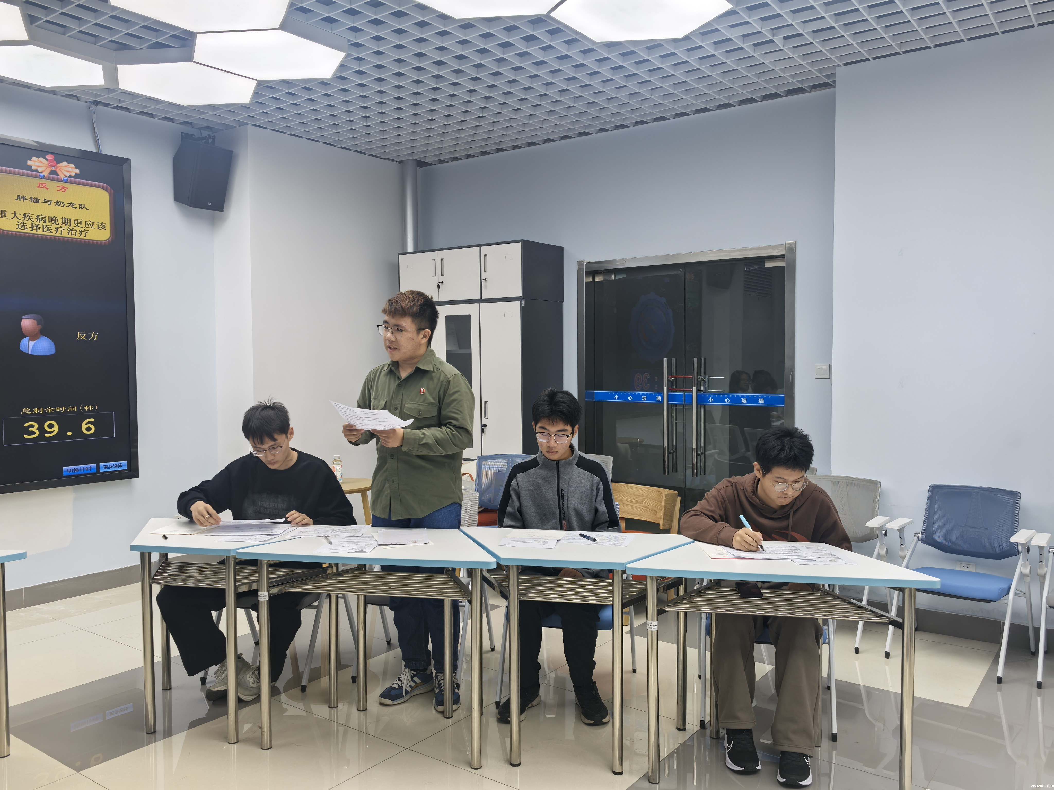 在求真厅的首场比赛于上午十点开始,辩题为“重大疾病晚期更应该选择顺其自然还是选择医疗救治”。主席李晓宣布辩论赛正式开始,正方“我说对就队”与反方“胖猫与奶龙队”辩手分别进行己方观点的简单陈述。正反方经过立论、质询、自由辩论和总结陈词四个环节,展现了一场针锋相对、精彩绝伦的辩论。双方辩手出色的表现和现场激动紧张的氛围引起场下观众阵阵喝彩。双方辩论结束后,评委沈浩铭、陈静慧进行点评,指出正反方辩手应熟悉辩论赛的程序规则,提前对基本概念问题达成共识,也可以通过列出数据等方式增强己方立论说服力。经过评委评分,主席李晓宣布反方获得初赛胜利。