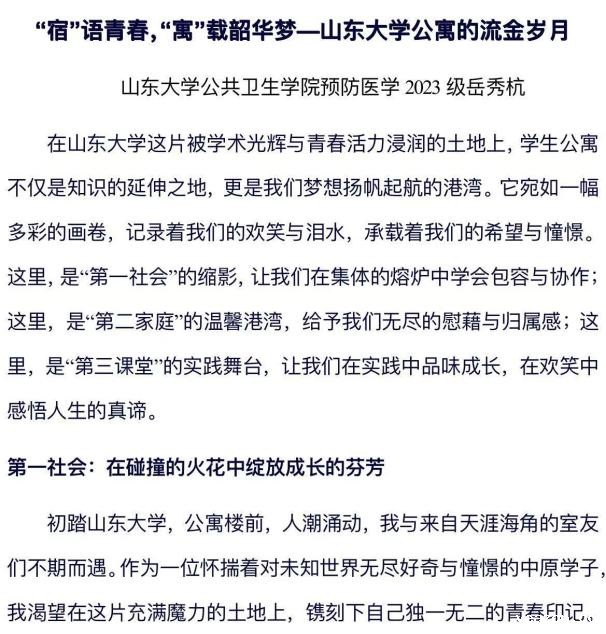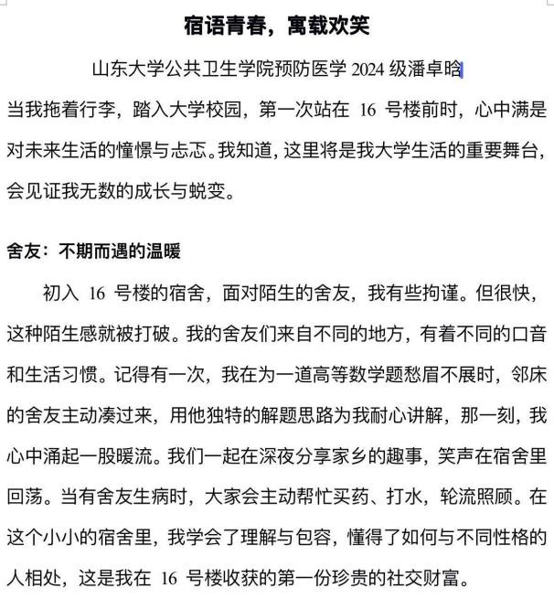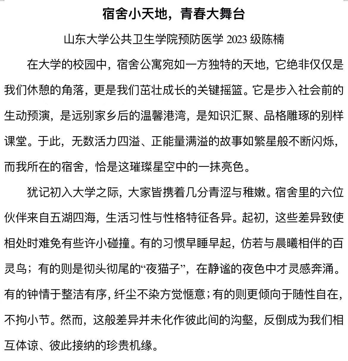 同学们的征文充分展现了他们们丰富多彩的宿舍生活和深厚的舍友情谊。在这个小小的宿舍空间里,青春在绽放,欢笑在蔓延,每一个故事都值得被珍藏,每一段回忆都如同璀璨星辰,照亮了我们的大学生活。