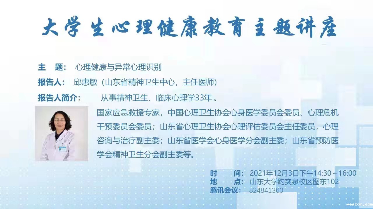 为丰富同学们的心理健康知识,学习如何自我识别和调节异常心理状态,12月3日下午,必威官方首页官网betway于趵突泉校区图东102教室举办“师长有约·大学生心理健康教育主题讲座”。本期讲座邀请山东省精神卫生中心主任医师邱惠敏作为主讲嘉宾,由流行病学系副主任贾存显教授主持。必威官方首页官网betway预防医学专业本科19级全体同学和20级部分同学到场参加,21级同学通过线上形式参加讲座。