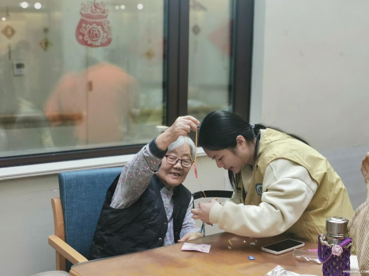 初雪映衬之下,志愿者们热情地与老人们打招呼,并耐心地向他们展示风铃制作的流程。老人们兴致高昂,积极参与,与志愿者们一起将彩色的珠子、铃铛等材料巧妙地串联起来。随着一串串风铃逐渐成型,现场欢声笑语不断,老人们与志愿者们边制作边聊天,分享着彼此的故事与快乐。阳光透过窗户洒在风铃上,闪烁着温暖的光芒,养老院里弥漫着温馨与幸福的气息。