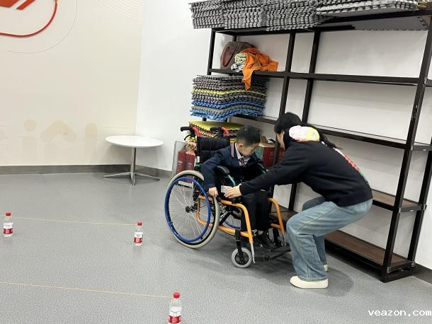 志愿者抵达后,瓷爱中心的工作人员对其进行了简短的介绍,紧接着各位志愿者便对活动场地进行了布置。现场设有轮椅通关体验、蒙眼挑战、答题闯关三个互动区和一个义卖区。