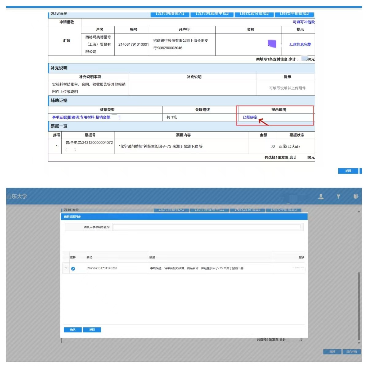 线上报销流程:预约报销单需“绑定辅助证据”,具体操作如下图所示。