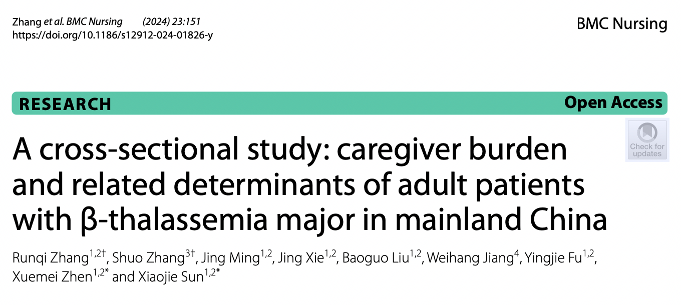 上述研究成果以“A cross-sectional study: caregiver burden and related determinants of adult patients with β-thalassemia major in mainland China”为题,发表于护理领域著名期刊BMC Nursing(中科院小类一区)。必威登录入口平台官网为第一作者单位和通讯作者单位,必威官方首页官网betway卫生管理与政策研究中心硕士研究生张润琪、张硕(现山东省公共卫生临床中心)为共同第一作者,甄雪梅副教授与孙晓杰教授为共同通讯作者。点击可获取电子版论文。