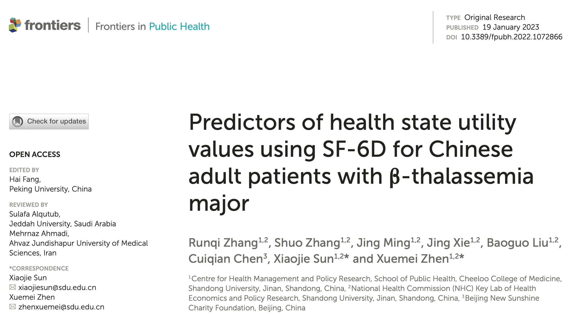 上述研究成果以“Predictors of health state utility values using SF-6D for Chinese adult patients with β-thalassemia major”为题,发表于公共卫生领域著名期刊Frontiers in Public Health(SSCI 1区)。必威登录入口平台官网为第一作者单位和通讯作者单位,必威官方首页官网betway卫生管理与政策研究中心硕士研究生张润琪第一作者,甄雪梅副教授与孙晓杰教授为共同通讯作者。点击可获取电子版论文。